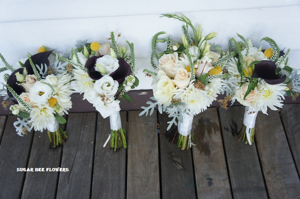 Bridesmaids bouquets with dahlias, lisianthus, calla lilies..